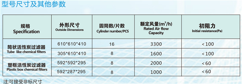 規(guī)格:筒狀活性炭過濾器610*610*410、305*610*410;塑框活性炭過濾器592*592*295、592*287*295