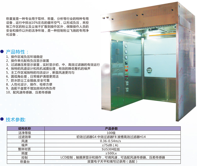 產(chǎn)品備注:稱量室是一種專業(yè)用于取樣、稱量、分析等行業(yè)的特種專用設(shè)備,運(yùn)行中排出10%左右的循環(huán)空氣,以形成負(fù)壓,來(lái)控制工作區(qū)的粉塵及塵埃不擴(kuò)散到操作區(qū)外,保障操作人員的安全和操作以外的潔凈環(huán)境,是一種控制粉塵飛揚(yáng)的專用凈化設(shè)備.