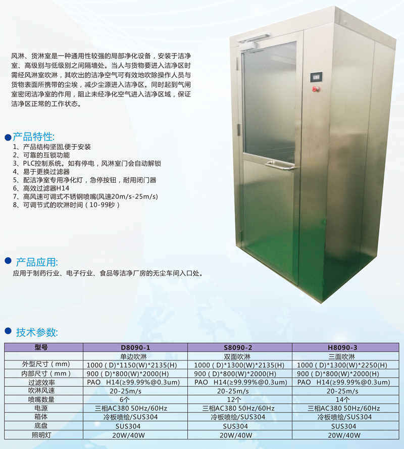 產(chǎn)品備注:風(fēng)淋、貨淋室是一種通用性較強(qiáng)的局部凈化設(shè)備,安裝于潔凈室、高級別與低級別之間隔墻處。當(dāng)人與貨物要進(jìn)入潔凈區(qū)時需經(jīng)風(fēng)淋室吹淋,其吹出的潔凈空氣可有效地吹除操作人員與貨物表面所攜帶的塵埃,減少塵源進(jìn)入潔凈區(qū)。同時起到氣閘室密閉潔凈室的作用,阻止未經(jīng)凈化空氣進(jìn)入潔凈區(qū)域,保證潔凈區(qū)正常的工作狀態(tài)。