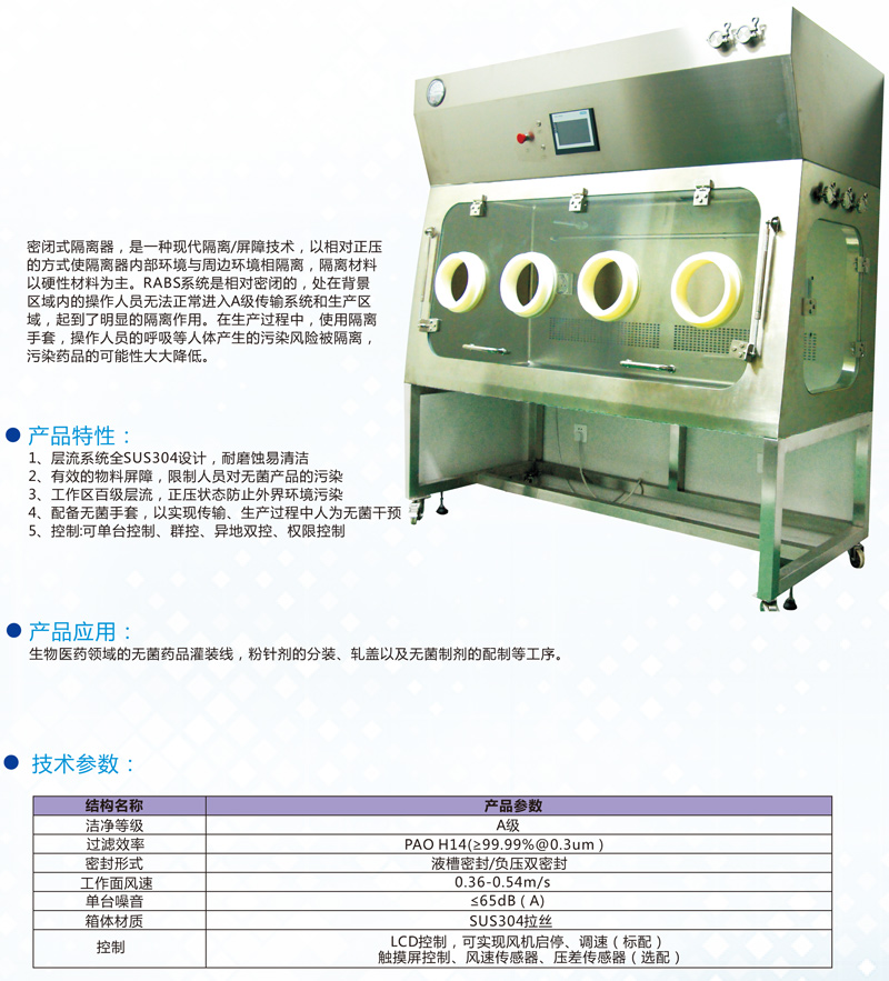 產(chǎn)品備注:密閉式隔離器,是一種現(xiàn)代隔離/屏障技術(shù),以相對(duì)正壓的方式使隔離器內(nèi)部環(huán)境與周邊環(huán)境相隔離,隔離材料以硬性材料為主。RABS系統(tǒng)是相對(duì)密閉的,處在背景區(qū)域內(nèi)的操作人員無法正常進(jìn)入A級(jí)傳輸系統(tǒng)和生產(chǎn)區(qū)域,起到了明顯的隔離作用。在生產(chǎn)過程中,使用隔離手套,操作人員的呼吸等人體產(chǎn)生的污染風(fēng)險(xiǎn)被隔離,污染藥品的可能性大大降低。