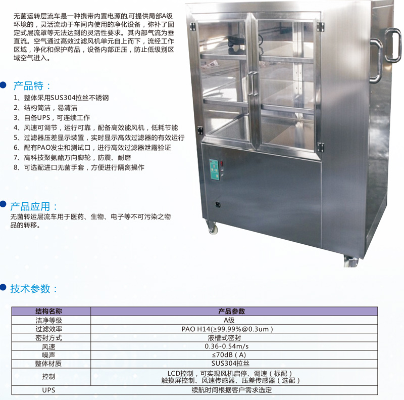產(chǎn)品備注:無菌運轉(zhuǎn)層流車是一種攜帶內(nèi)置電源的,可提供局部A級環(huán)境的,靈活流動于車間內(nèi)使用的凈化設(shè)備,彌補了固定式層流罩等無法達到的靈活性要求。其內(nèi)部氣流為垂直流??諝馔ㄟ^高效過濾風(fēng)機單元自上而下,流經(jīng)工作區(qū)域,凈化和保護藥品,設(shè)備內(nèi)部正壓,防止低級別區(qū)域空氣進入。
